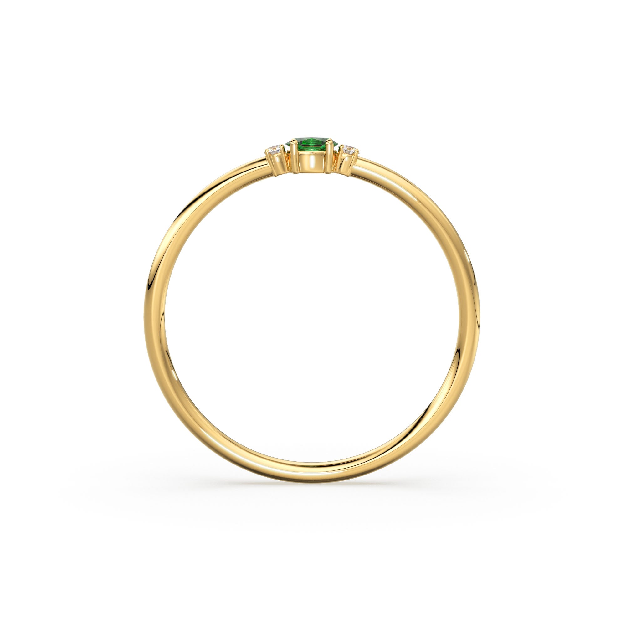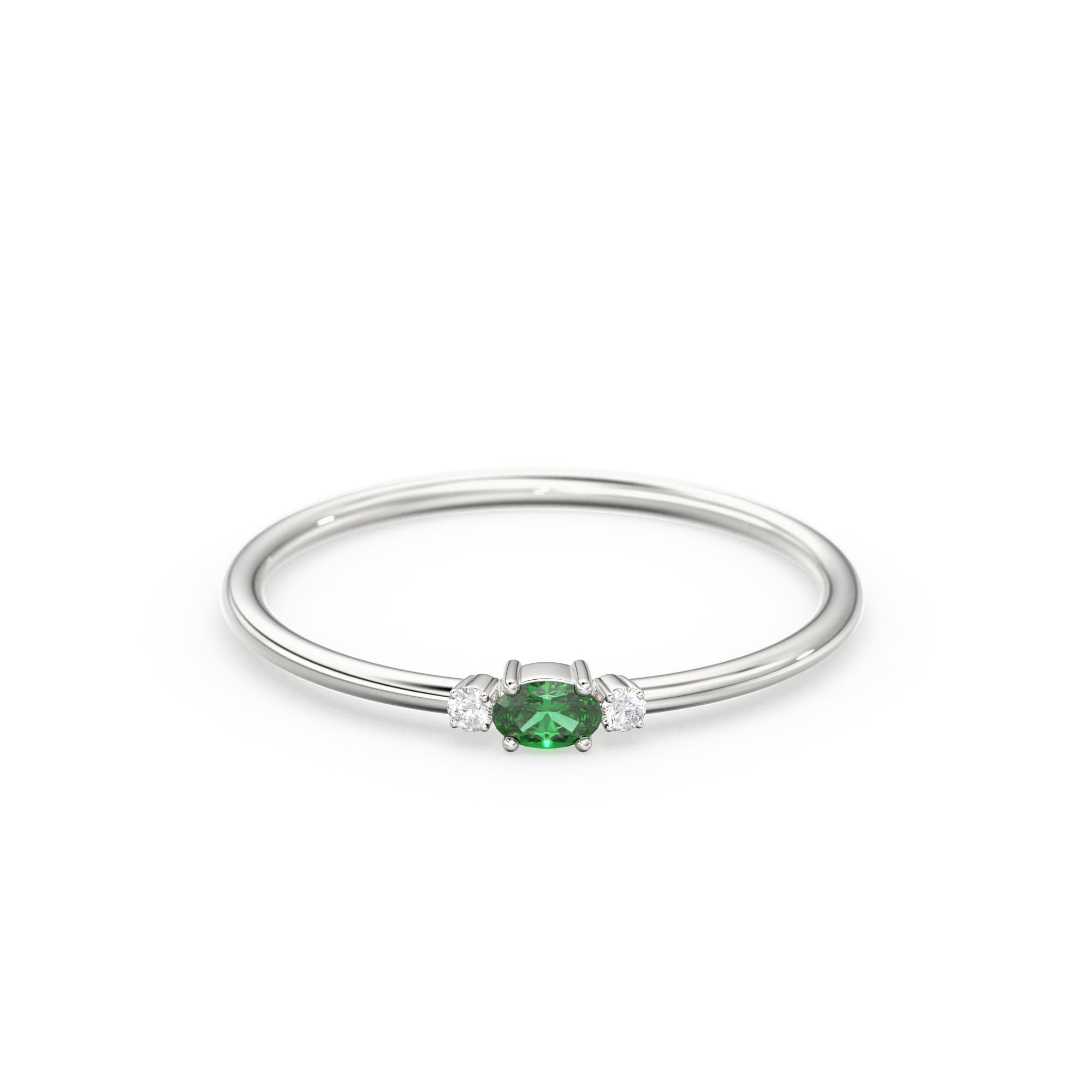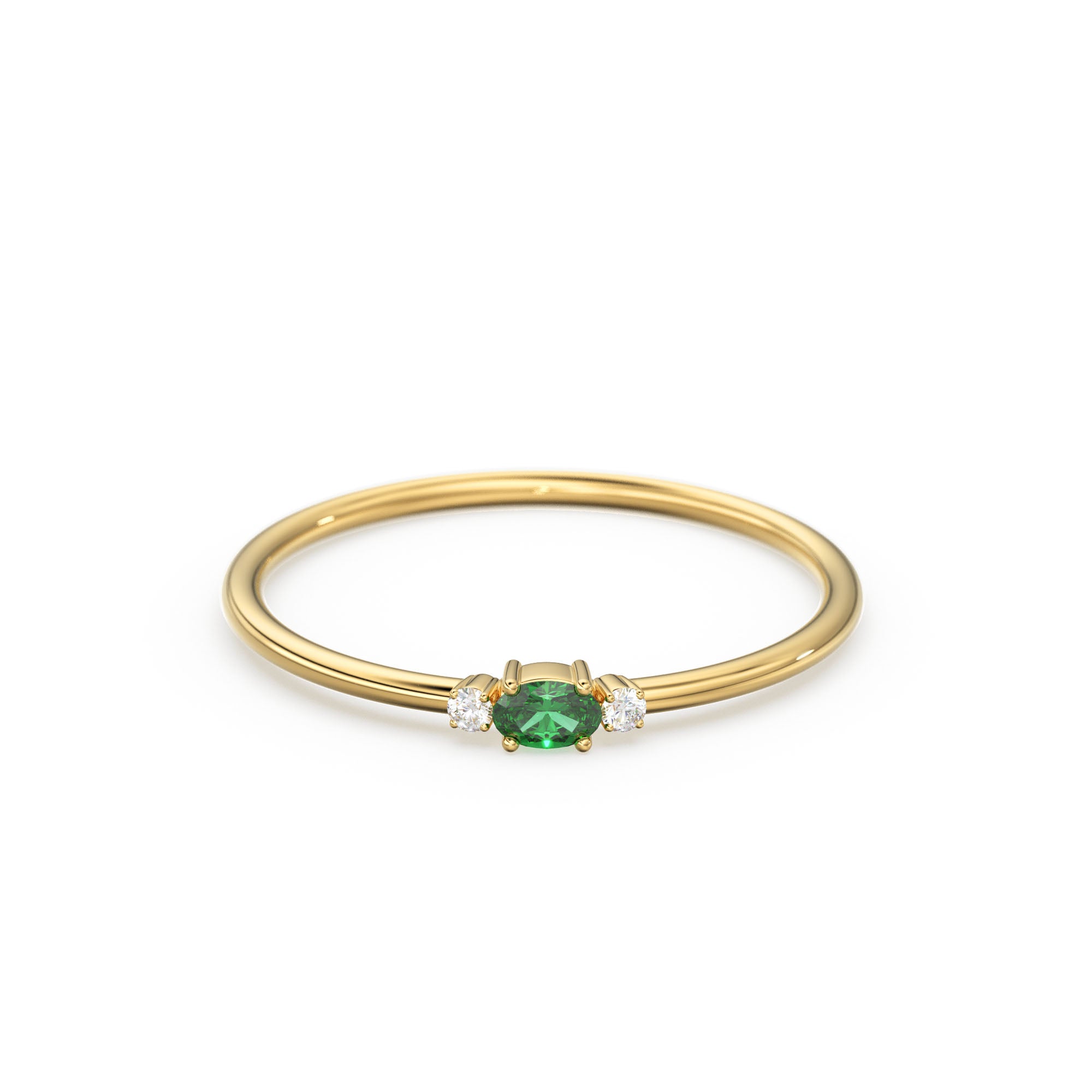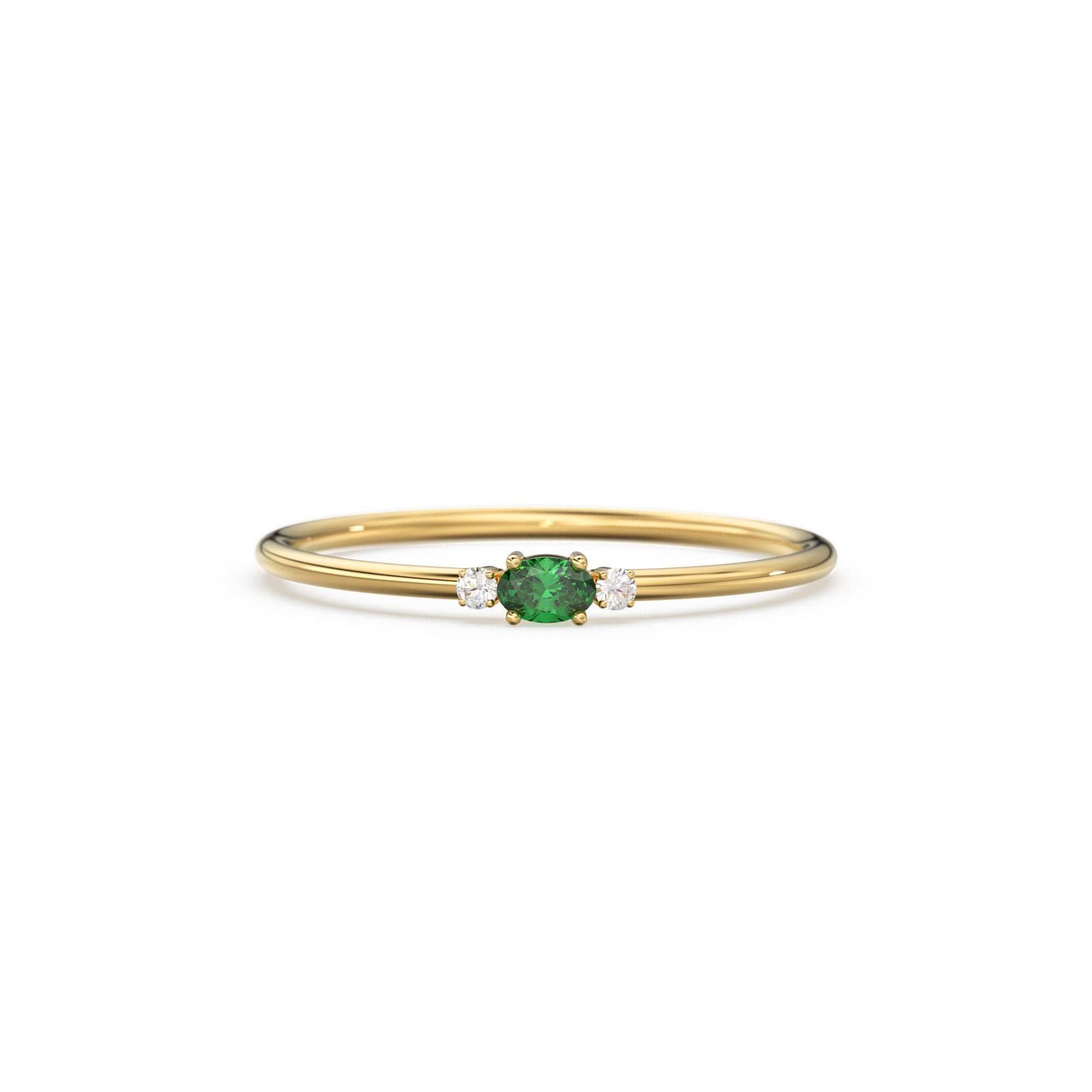 A brilliant oval Emerald (prong-set) sits prominently at the center of a thin 14K gold band with two glittering round cut diamonds on either side. We offer three custom gold colors so you can create a gift as striking and unique as the love of your life. Choose from: Rose Gold, Yellow Gold, and White Rhodium. Every day you spend laughing and loving with her is one to be celebrated. Surprise her this gorgeous gold diamond trio ring for a birthday, anniversary, or just because.