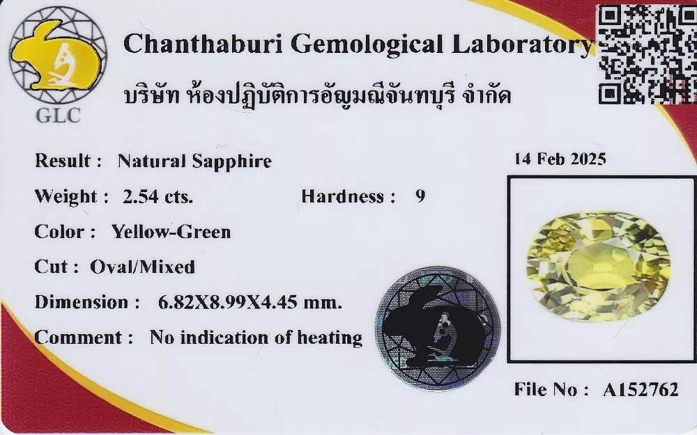 This Sapphire originates from Songea, Tanzania and it weighs 2.54 carats. This Yellow-Green, Oval shape stone, is size 8.99 x 6.82 x 4.45 mm. Thanks again! We look forward to serving you.