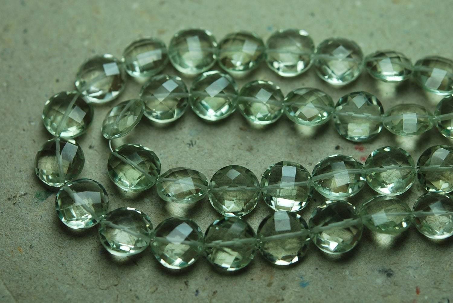 7 Inch Strand, Finest Quality, Natural Green Amethyst Matched Pair 10mm Size, Faceted Coins Shaped Briolettes