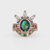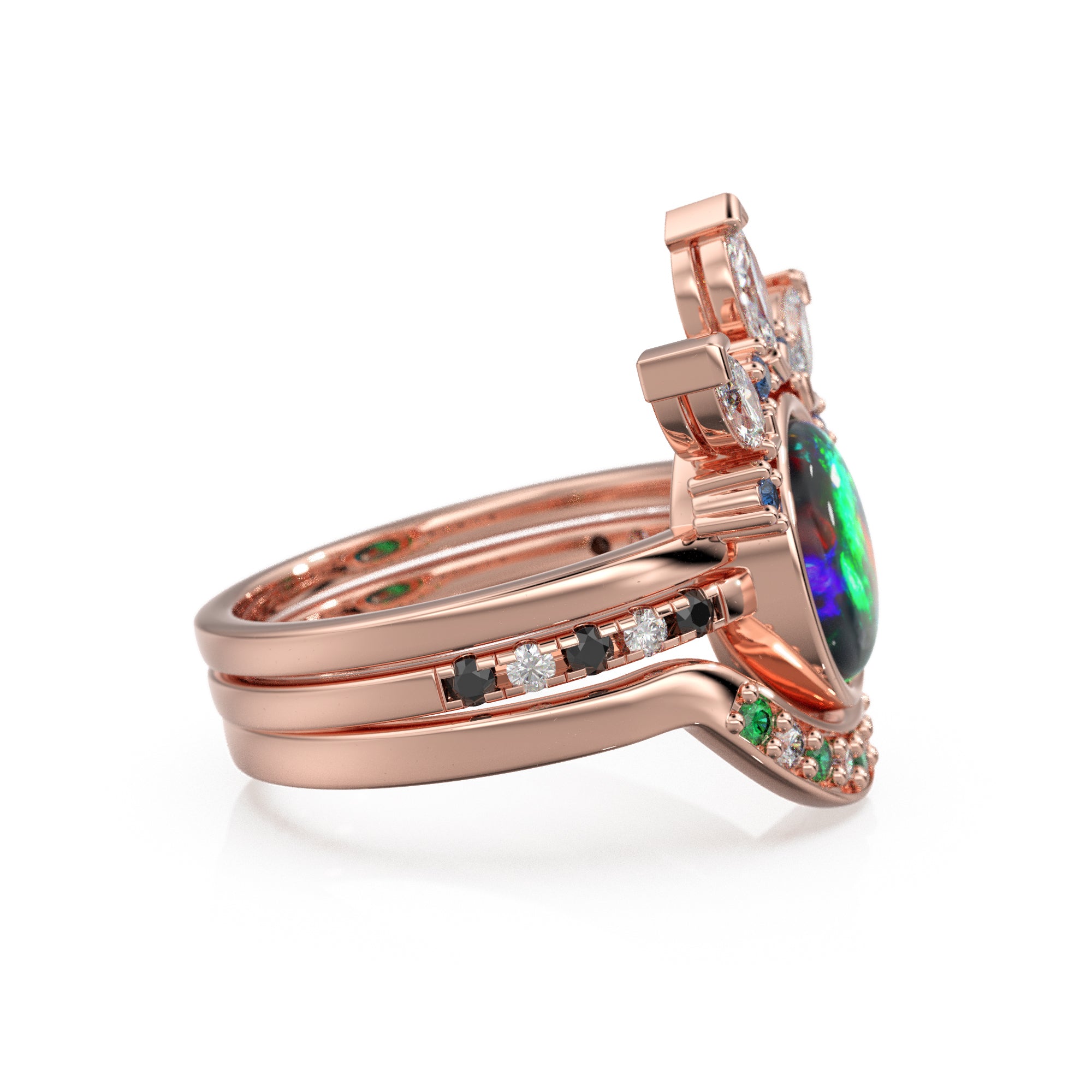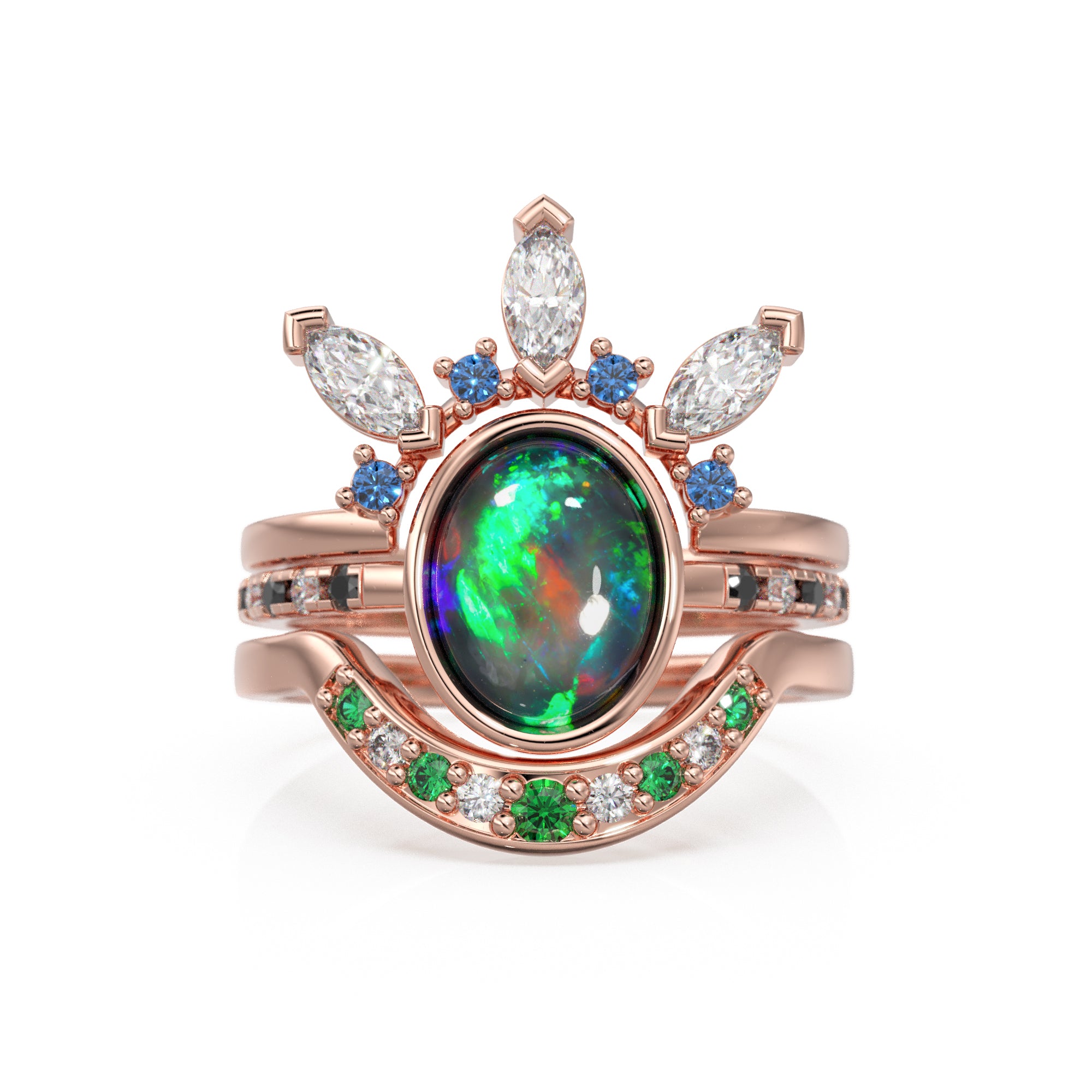 Black Opal Engagement Ring Set, Lab Diamond Lightning Ridge Solid Rose Gold Opal Ring, Blue Sapphire Lagoon Set