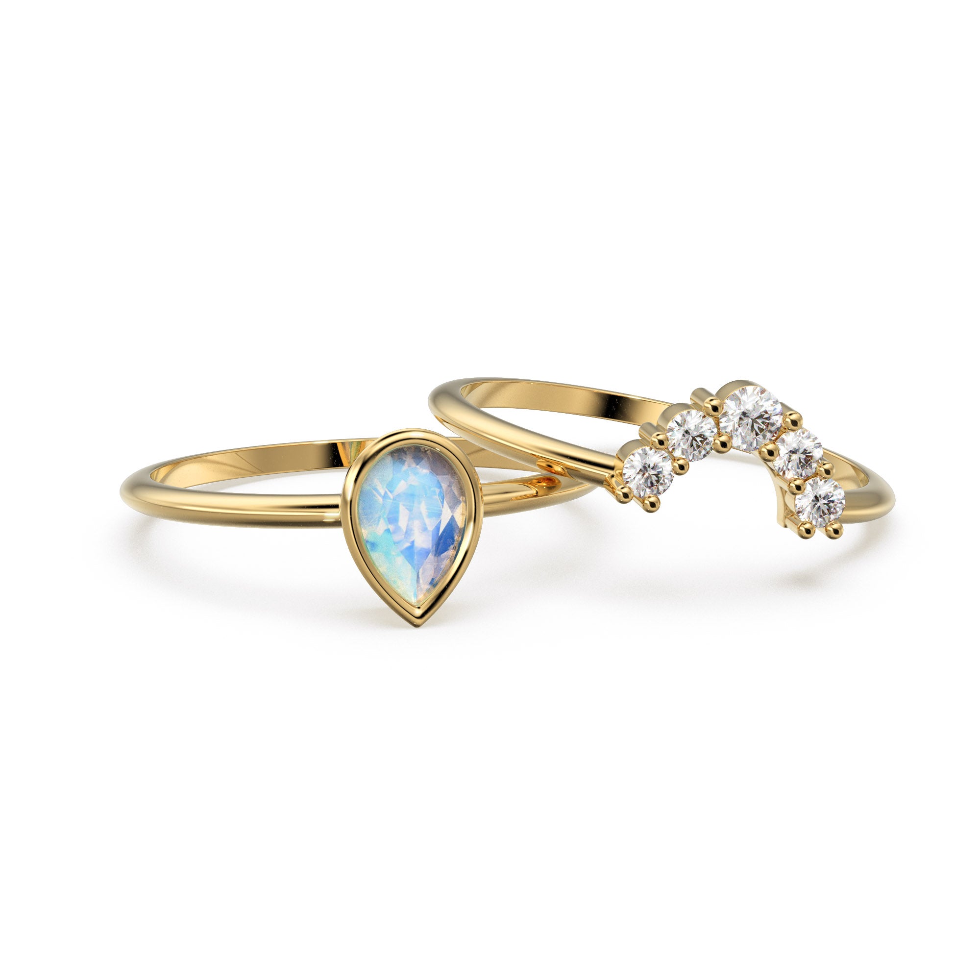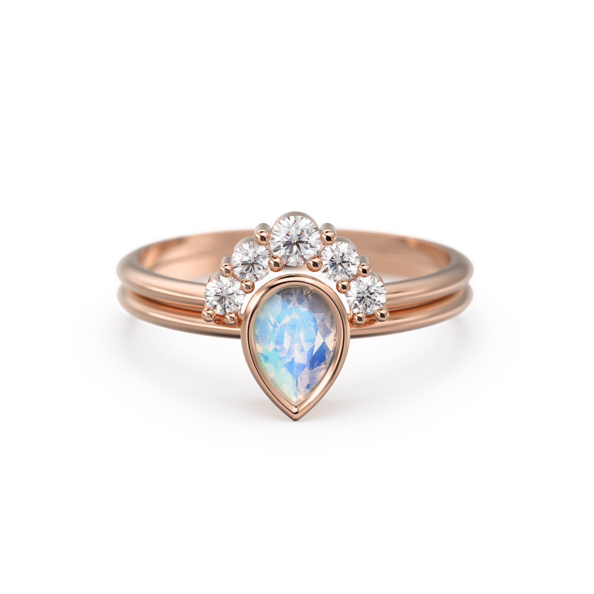 Pear Moonstone Ring Set, Lab Diamond Crown Ring with Moonstone Solitaire Ring, Moonstone Diamond Ring Set, simple Ring Set